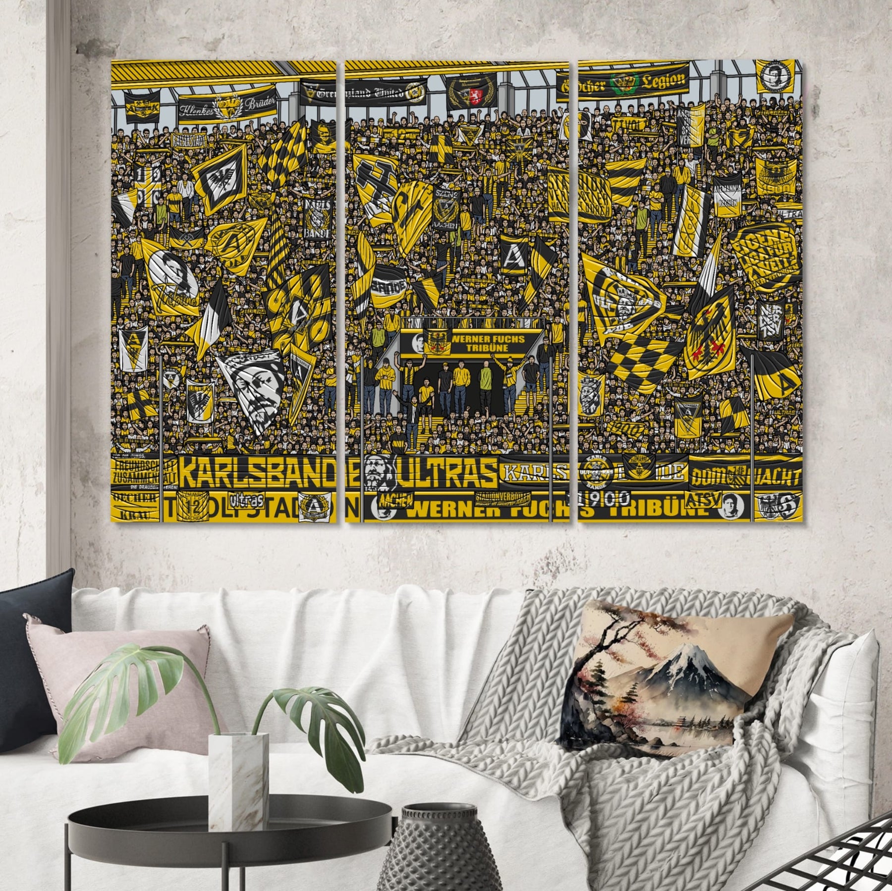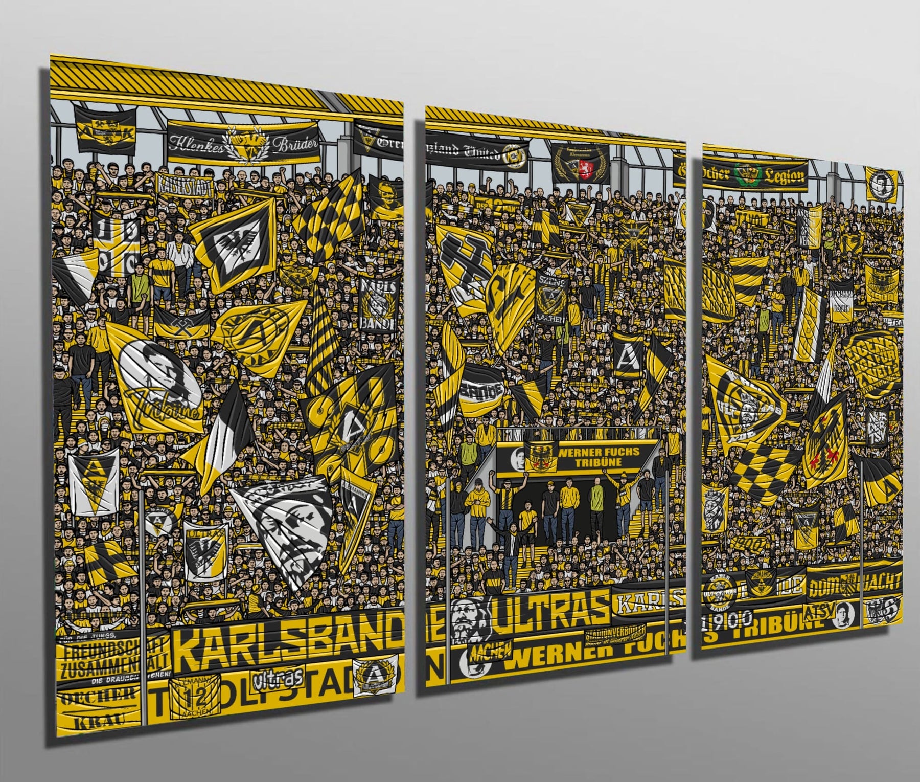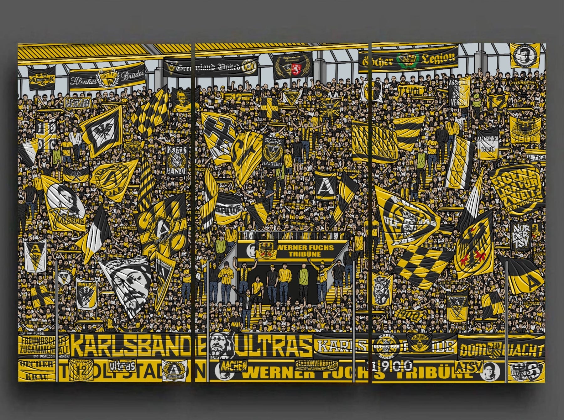 Wir haben 10 dreiteilige Leinwandsets mit dem Aachen Motiv von Gabriel Kilcoyne hergestellt. Jeder Teil hat eine Größe von 3x80x40 cm