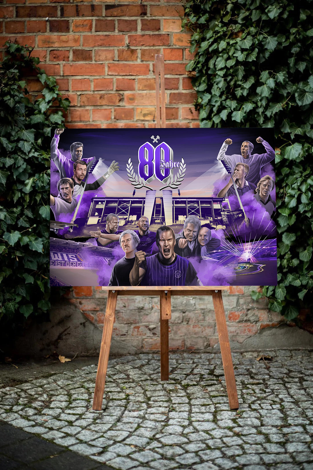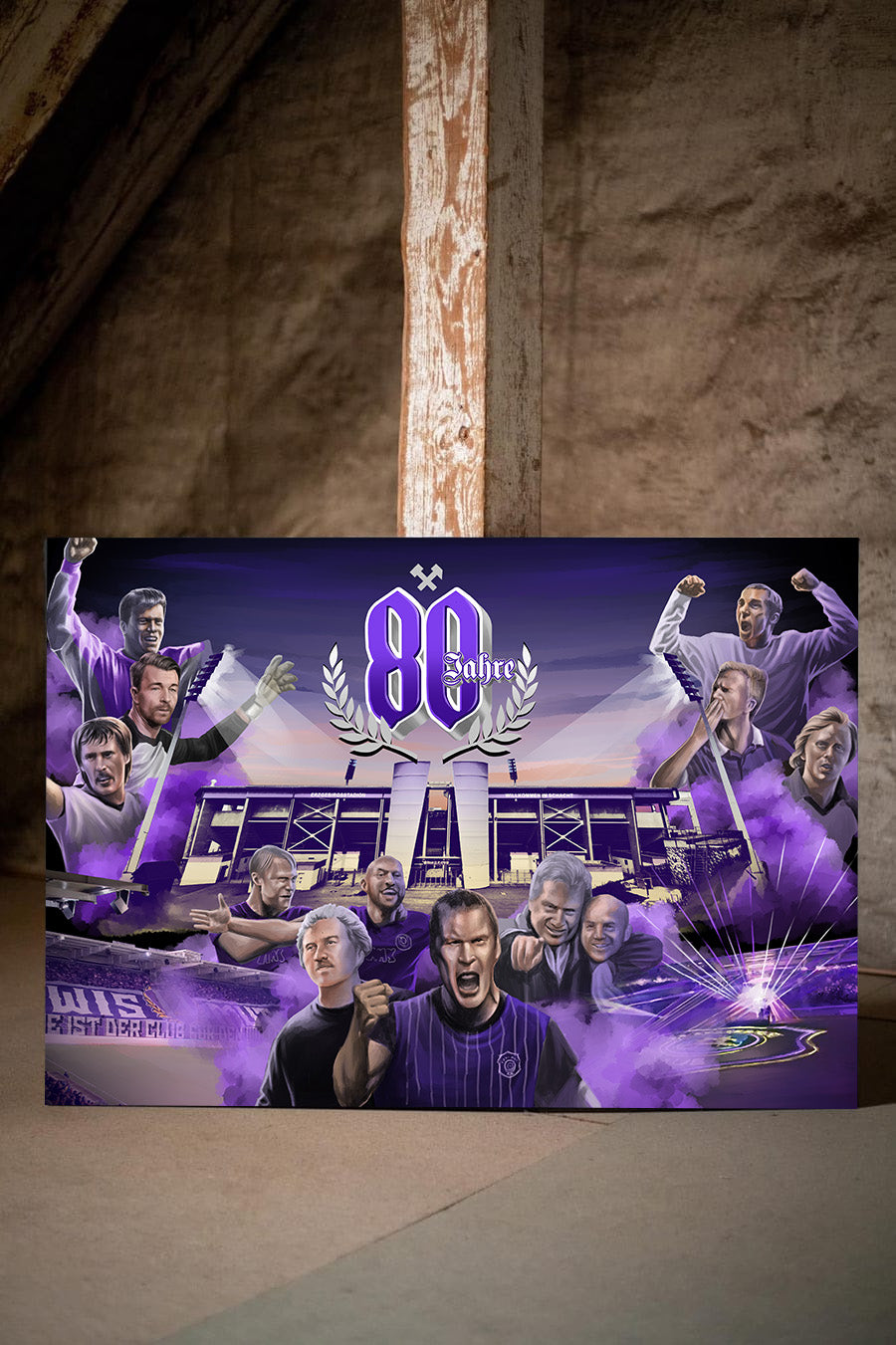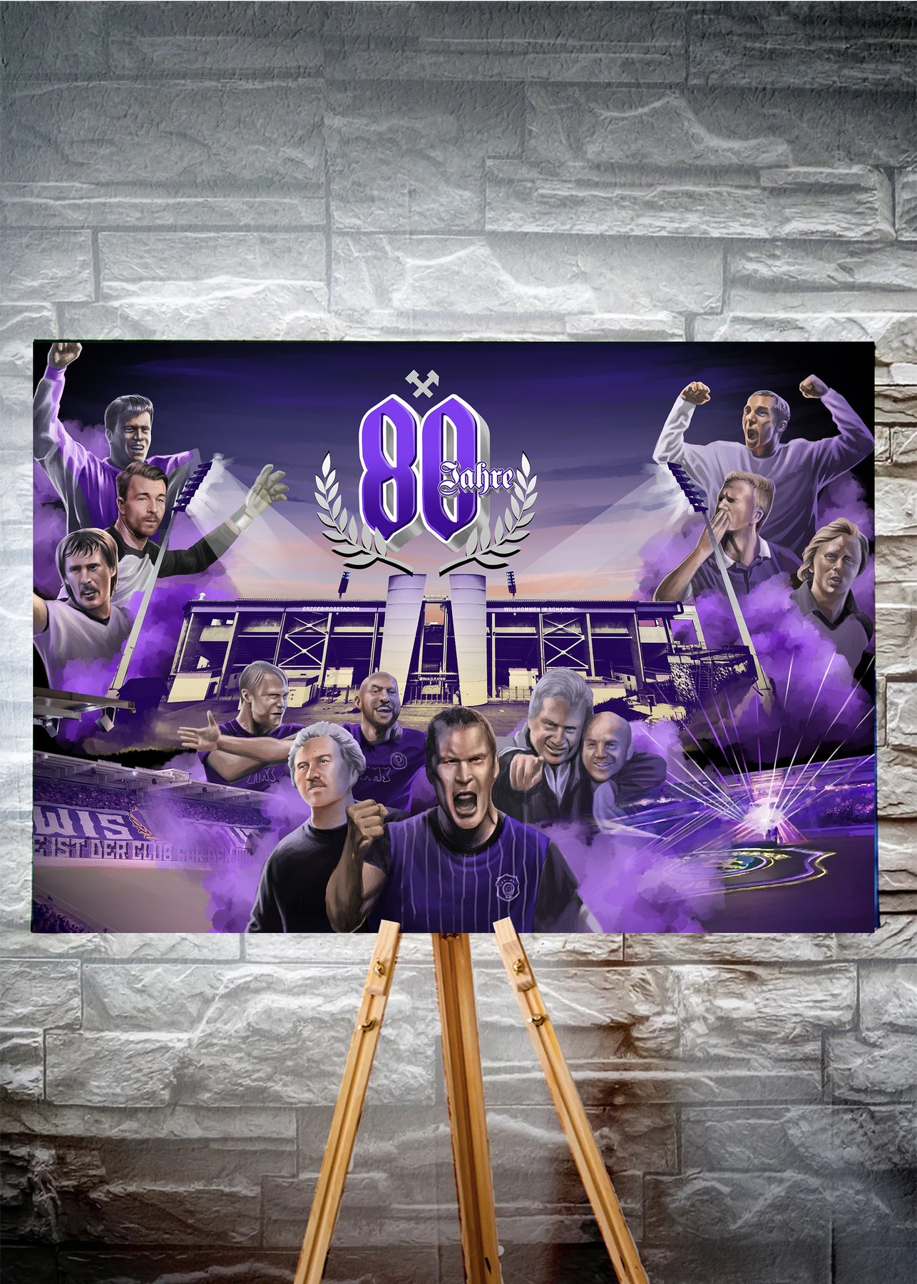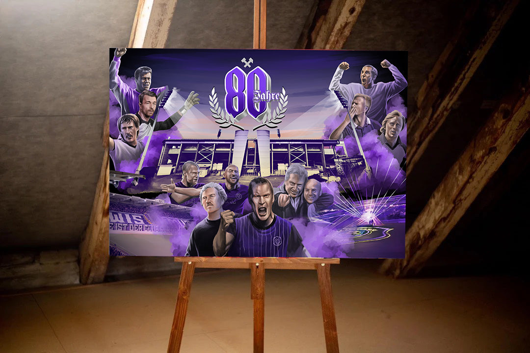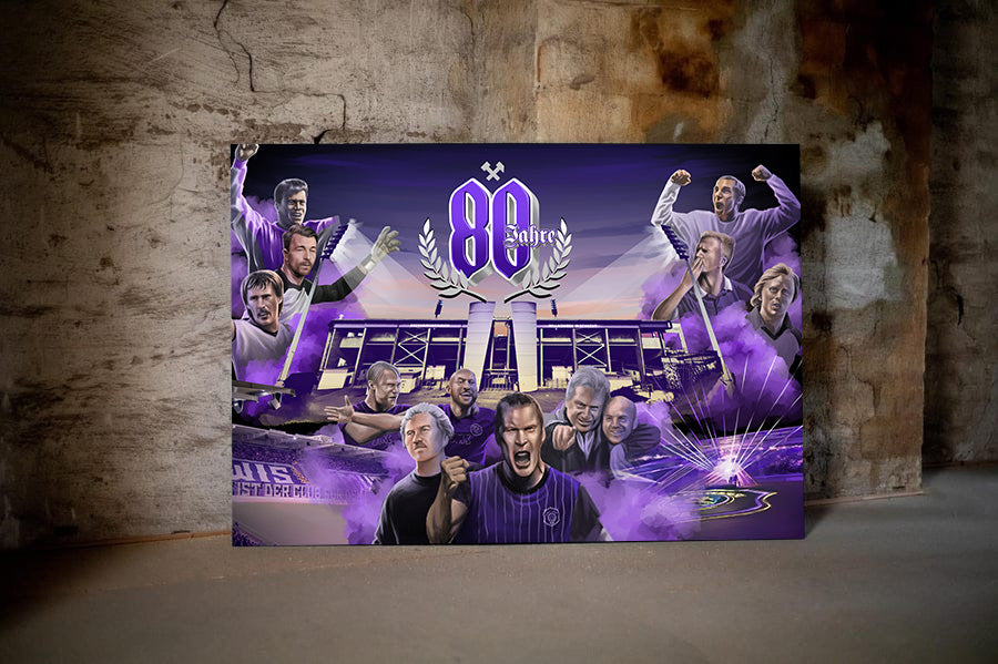 Aue Jubiläums-Leinwandbild des Fan-Art Künstlers Truelife. Das Werk ist limitiert auf 60 Exemplare verteilt auf vier Größen. Die Lieferung erfolgt fertig aufgespannt auf Keilrahmen. Jeder Käufer erhält per mail ein Zertifikat mit Namen und Bildnummer .